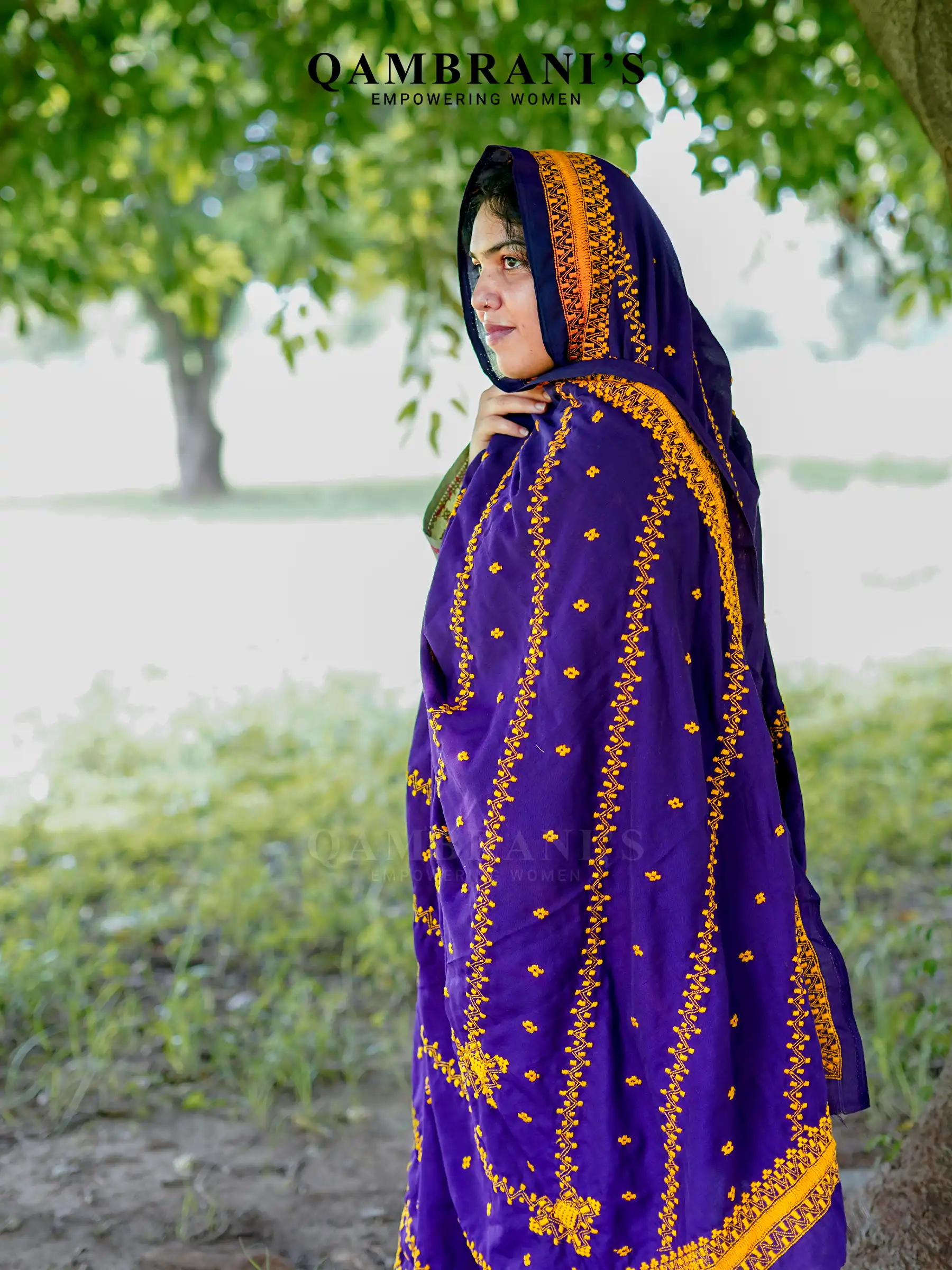 Handmade Balochi Shawl Chadar – Royal Purple with Golden Yellow Embroidery